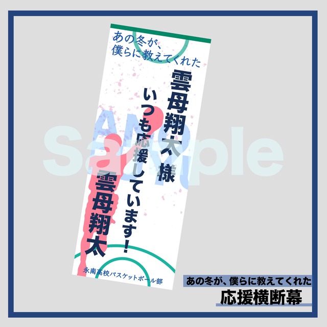 応援横断幕 15000円 Uzume第14回公演「あの冬が、僕らに教えてくれた」に出演するキャストを応援する特別な横断幕。 横断幕は劇場内に展示され、お客様からの応援が"キャスト"そして"作品"に力を与えます。 応援横断幕と一緒に、本公演をお楽しみください。 -------------------------------------------------------------------------------- Uzume第14回公演「あの冬が、僕らに教えてくれた」-永南高校バスケットボール部-では、 祝い花の受け付けをお断りしております。 その代用といたしまして、お客様の氏名入りの『応援横断幕』を展示いたします 横断幕は客席後方に展示させていただきます。 応援グッズには、”応援するキャスト名”と”お客様のお名前”、ご指定頂いた”応援メッセージ”を入れさせて頂きます。 ご希望のメッセージを下記の選択肢よりお選びください。 A.「いつも応援しています!」 B.「好きこそ無敵!」 C.「君が主役だ!」 D.「この瞬間を楽しもう!」 E.「やっぱり君が大好きだ!」 F.「あなたならできる」 G. 君の言葉が、物語を動かす H. 勝利を信じて突き進め! I. 想いをゴールに叩き込め! ※必ず備考欄にキャスト名、お客さまのお名前、ご希望のメッセージのアルファベットをご記載ください。 (キャスト名、お客さま名に記載できる文字数は、各最大6文字となります。愛称でも可能ですがキャスト名には、敬称(様)がつきます) ◉備考欄記載例◉ キャスト名 ○○○○○○様 お客様名 ○○○○○○ 応援メッセージ A〜Iをお選びください ※展示物を発送希望の方は「発送希望」と記入 ------------------------------------------------------------------------------------------ 展示物について ◇サイズ:1サイズ◇大きさ:W600✖︎H1500 ◆文字のフォントはお選びいただけません。 ◆画像はサンプルです。実物と異なることがありますのでご了承ください。 ◆注意事項 ・本商品は応援グッズの展示券です。展示券の発送をもって、商品の発送連絡となります。 ・展示物は本公演終了後こちらで回収・廃棄させていただきます。 ・展示物の発送を希望の方には、着払いにて、展示物を本公演終了後1ヶ月以内にお送りさせていただきます。必ずご購入時の備考欄にご記入ください。 ・展示は会場にてご確認下さい。 ・備考欄にキャストとお客様のお名前がない場合、こちらからメールにてご連絡させて頂きますが、3日以内にお返事をいただけない場合自動キャンセルとなりますので予めご了承ください。 ・希望のメッセージにご記載がない場合は「いつも応援しています!」とさせていただきます。